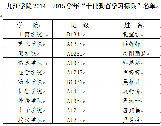 根据九江学院“十佳大学生”、“十佳勤奋学习标兵”评选标准,经本人申请,二级学院审核、推荐,学校“十佳大学生”、“十佳勤奋学习标兵”评审委员会评选,拟授予以下20名同学2014—2015学年“十佳大学生”、“十佳勤奋学习标兵”称号,现予以公示: