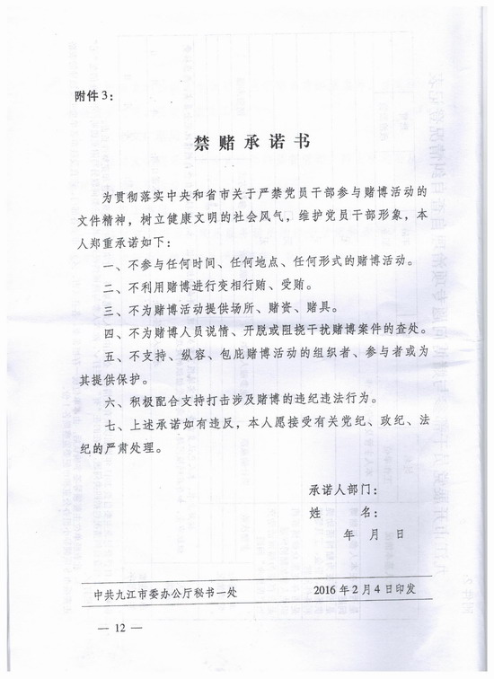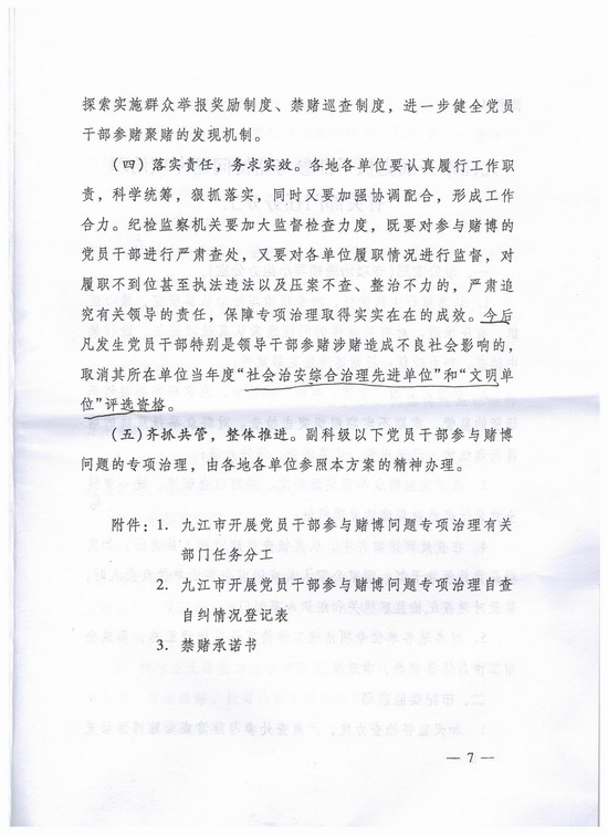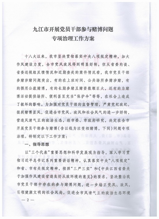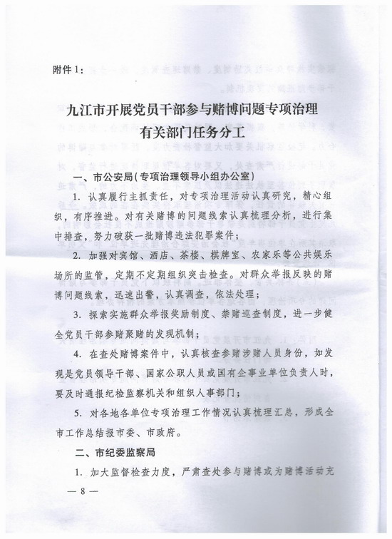 九江市市委办公厅、市政府办公厅关于印发《九江市开展党员干部参与赌博问题专项治理工作方案》的通知