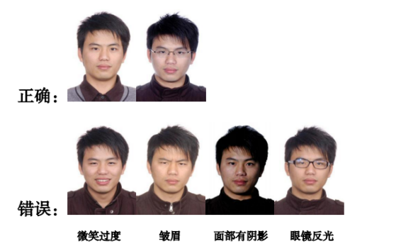 3.申领需要提供电子寸照,面部表情要求较高,为避免返工,尽量提供证件照。如下为正确、规范照片及错误照片对比: