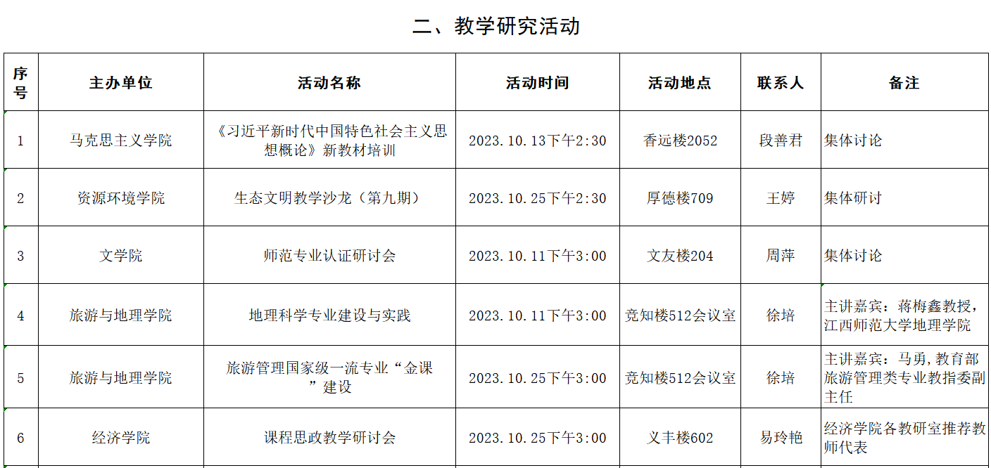 九江学院2023年10月学术(科学)研究、教学研究活动预告