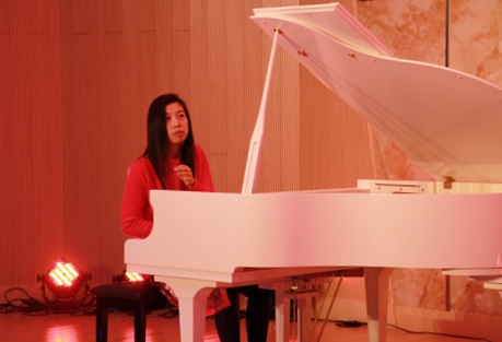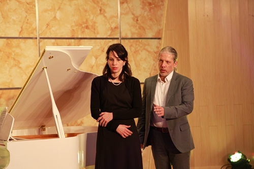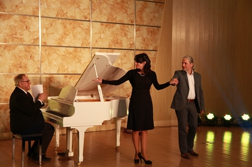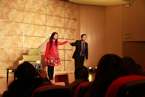 晚会由体育学院学生表演的中华传统武术拉开序幕。狮舞、旗舞,以及拳术、刀术的表演,令人目不暇接,让人感受到中国功夫的韵味。随后是九江京剧票友、我校艺术学院民乐队表演的京胡协奏曲《夜深沉》,是从昆曲《孽海记·思凡》中的《风吹荷叶煞》的四句唱腔发展而来的一首脍炙人口的京剧曲牌。其由京胡独奏,击鼓相伴。这种独特的表演形式,富有中国民族气派,使乐曲更添光彩。而德籍华裔青年钢琴演奏家、钢琴教育家、德国柏林汉斯·埃斯勒音乐学院的钢琴老师韩卉菁女士独奏了中国钢琴作品《浏阳河》。此钢琴曲是上个世纪七十年代由民歌改编而来,其旋律十分优美,使听众不自觉地有一种怀旧的情绪。青年歌剧演唱家、博士、九江学院柔性引进的德国音乐家团队的负责人熊柯嘉先生演唱了意大利民歌《请别忘记我》,深情、悠扬,完成一个漂亮的开场时,他牵着为其伴奏的韩卉菁女士的手,优雅地迎着观众的掌声致谢,韩卉菁女士还为熊柯嘉先生伴奏了他演唱的《红楼梦》插曲《红豆词》。