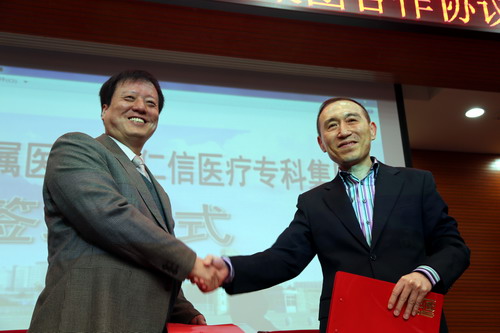 仪式上,临床医学院/附属医院院长张志平与香港仁信专科集团董事王海星共同签订了双方合作协议。根据协议,双方合作分为三个阶段。第一阶段:自2015年1月起,双方共建附属医院乳腺(肿瘤)科。附属医院负责场地、人员、设备等的准备和筹建,办理来院专家、教授工作的手续及工作资质的认定等。仁信集团负责提供符合资质的国际一流专家、教授团队来院工作。第二阶段:双方共建的附属医院乳腺(肿瘤)科做大做强后,条件成熟时,向省卫委申报“九江学院国际乳腺中心”。第三阶段:“九江学院国际乳腺中心” 做大做强后,条件成熟时,向省卫委申报“九江学院附属乳腺(肿瘤)专科医院”。