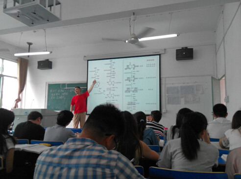 课堂上,涂岩老师对“嘌呤的降解”过程进行了详细的讲解。涂老师讲解过程语言形象生动,板书与多媒体相辅相成,并不时与学生互动,课堂效果良好。魏书记与同学们一起专注听课,并认真地做着听课记录。