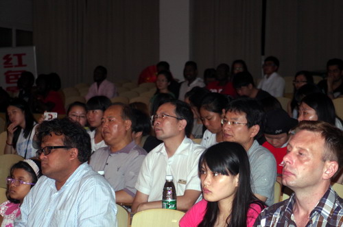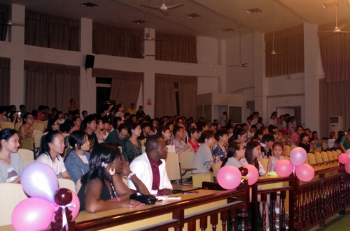 音乐会的帷幕在高瞻带来的京剧反串《霸王别姬》“看大王、劝君王”的选段中被拉开,男声独唱《父亲》、《拉住妈妈的手》在表演者高瞻专业性的演唱技巧中,浓浓的亲情被表现得淋漓尽致,勾起在坐同学们对亲人的思念;本场音乐会形式多样,不仅是歌曲的演唱,钢琴独奏、歌伴舞、长号独奏、铜管五重奏等节目的表演也让观众们耳目一新。还有艺术学院教师蔡圆圆友情助阵,带来钢琴四手联弹,默契的配合宛如只有一人在弹奏。在会场闪烁的灯光下,音乐会的气氛逐渐推向高潮,张彩柳和kofi联手带来的歌舞剧《远方》,好似倾诉了一场忧伤的爱情故事,kofi来自国际交流学院的加纳籍学生,但他对中文歌曲的演唱却毫不逊色,引来在坐观众的雷鸣般的掌声,更有来自国际交流学院的同学们的加油助阵,把音乐会的氛围推向了高潮。