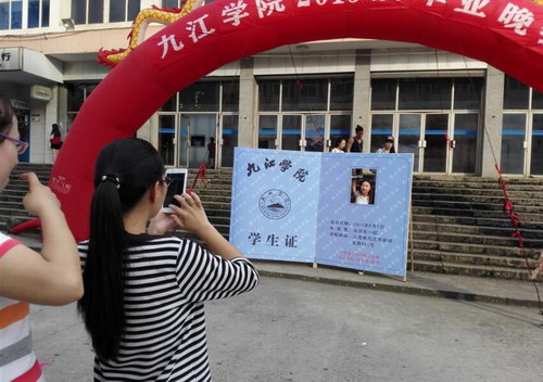 晚会入口处设置了一个神秘纪念物——巨型学生证。一样的款式,不同的意义。依依不舍,2015年毕业季,永远和你在一起。参加活动的毕业生纷纷与这个学生证plus一起合影,留住那美好的一刻。