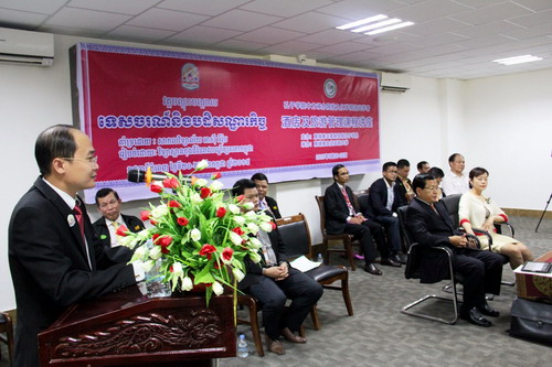 7月22日,由柬埔寨王家研究院孔子学院主办,亚欧大学承办的“酒店及旅游管理培训班”结业典礼在金边亚欧大学金色大楼会议室举行。柬埔寨旅游部国务秘书(副部长)斯当索坤阁下(H.E. SDEUNG SOKHOM),中国驻柬埔寨大使馆二等秘书韩静女士,柬埔寨王家研究院孔子学院院长谢莫尼勒阁下(H.E.CHEA MUNYRITH)、中方院长帅式毅,九江学院选派的培训教师王丽霞、李翔宇,亚欧大学校长谢索皮博士(CHEA SOPHEAP)、各学院负责人、中文系全体公派教师及汉语教师志愿者及经济及旅游管理学院全体学生参加了结业典礼。
