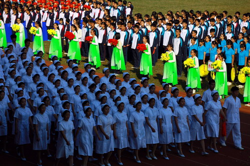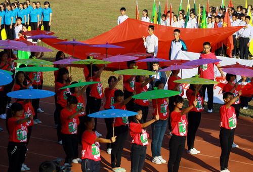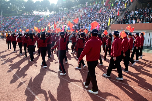 校长甘筱青致开幕词。甘校长指出,体育既是促进学校发展,实现培养目标的重要手段,也是学校加强精神文明建设,培养学生优良品质的重要举措。近年来,学校多次组队参加全省,全国乃至国际性的比赛,成绩喜人,为学校争取荣誉。举办运动会,是对我校体育工作,师生精神风貌和综合素质的大检阅。