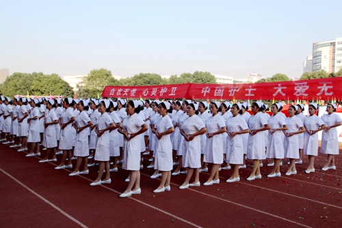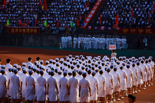 上午8点,场内所有人员注视田径场中心,护国旗队、护校旗队、护会旗队、护会徽队伴随着铿锵有力、激昂奋进的运动员进行曲依次入场。他们英姿飒爽,他们意气风发,他们代表了九院学子对此次运动会的关注与热情。鲜艳的五星红旗在初秋的晨风中鲜艳夺目,校旗、会旗和会徽交相辉映,庄严、神圣。紧随其后的管乐队、鲜花队、彩旗队彰显了我校学子的青春风采,裁判员代表队整齐的步伐彰显了他们严谨、公正的执法风格。