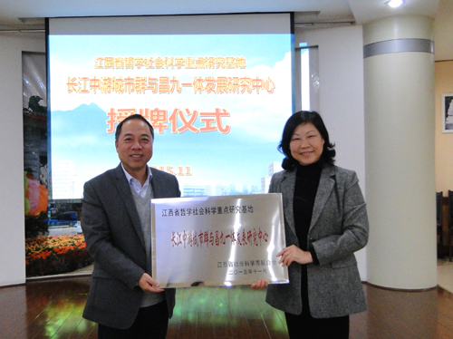 11月26日下午,江西省哲学社会科学重点研究基地“长江中游城市群与昌九一体发展研究中心”授牌仪式在我校行政楼一号会议室隆重举行。江西省社联胡春晓副主席、《内部论坛》曹彩蓉主编、曹高明编辑,九江学院校长、基地首席科学家甘筱青,九江学院副校长纪岗昌,科研处王侃民处长,经管学院、会计学院、旅游学院、基础医学院和政法学院等学院教师代表和长江中游城市群与昌九一体发展研究中心全体研究人员参加了授牌仪式。授牌仪式由副校长纪岗昌主持。