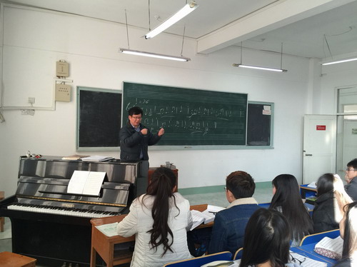 课堂上,于淦老师在讲授《视唱练耳1》课过程中,注重示范,语言生动活泼,与学生互动性强。王副校长与同学们一起聚精会神地听课,并做了认真地听课记录。