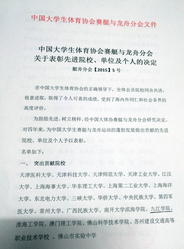 九江学院被中国大学生体育协会龙舟与赛艇分会评为突出贡献单位