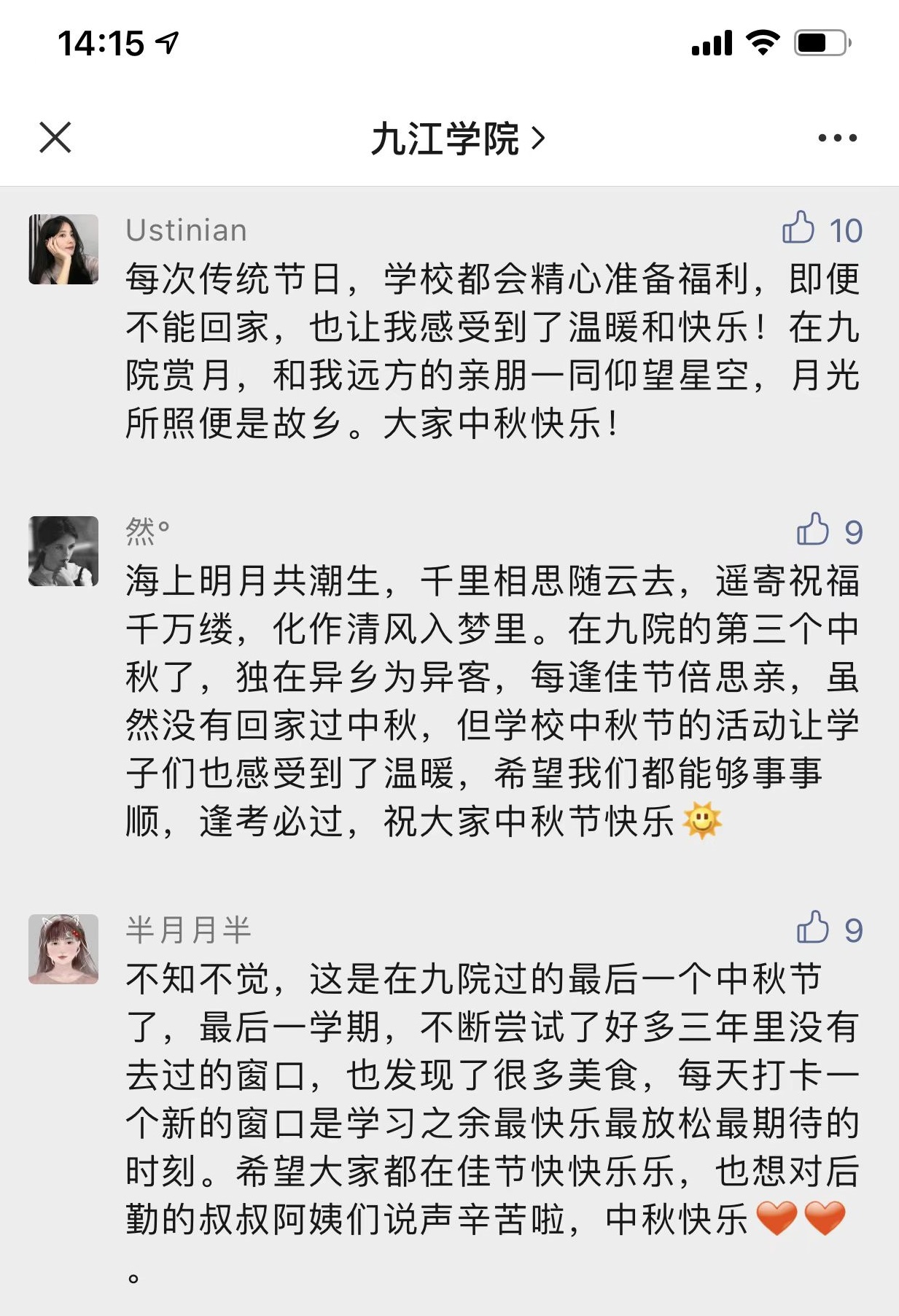 “每次传统节日,学校都会精心准备福利,即便不能回家,也让我感受到了温暖和快乐!”“作为一名大一新生,第一次离家过中秋,看到朋友学校发的月饼还以为我们学校不会发月饼,有点失落,但现在不用担心了,因为我知道,我与九院相遇了,未来四年里,我都会与九院月饼相伴,和九院学子共度佳节,共赏皓月” ……在九江学院微信公众号和九院后勤公众号里一条条温馨留言,感动着每一个九院人,这些留言都源于这几日我校后勤管理处饮食服务中心开展的一场“佳节不忘光盘礼,浓情更惜月饼情”活动。这是学校后勤管理处又一次在我国传统节日为师生发放福利,也再次表明九院后勤干部员工们正用实际行动聚焦立德树人根本任务,用心用情为九院师生办好实事。