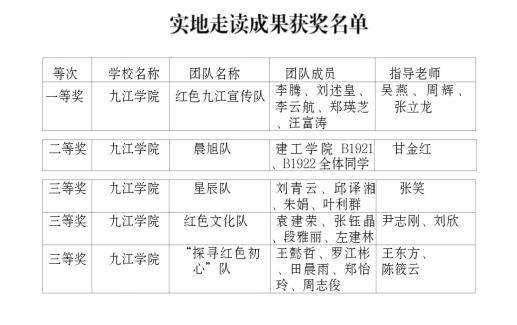 我校各二级学院积极开展“唱响红色经典,凝聚奋进力量”“红色走读”活动,教育引导广大青年学生坚定理想信念,自觉争当红色基因的传承者、实践者。近日,省委教育工委、省教育厅组织开展的全省高校“红色走读”活动获奖名单公布,我校多个团队取得优异成绩,荣获“实地走读成果”一等奖1个、二等奖1个、三等奖3个;荣获“讲述发生在江西红土地上的党史故事比赛”三等奖4个。各二级学院开展“三下乡”暑期学生社会实践活动,其中,外国语学院青年大学生赴东山村“三下乡”实践服务队被评为九江市大中专学生志愿者暑期文化科技卫生“三下乡”社会实践活动优秀服务队,文学与传媒学院三下乡服务队喜获2021年度九江市大中专学生志愿者暑期文化科技卫生“三下乡”社会实践活动优秀服务队、2021年度九江学院暑期文化科技卫生“三下乡”社会实践活动优秀服务队荣誉称号。