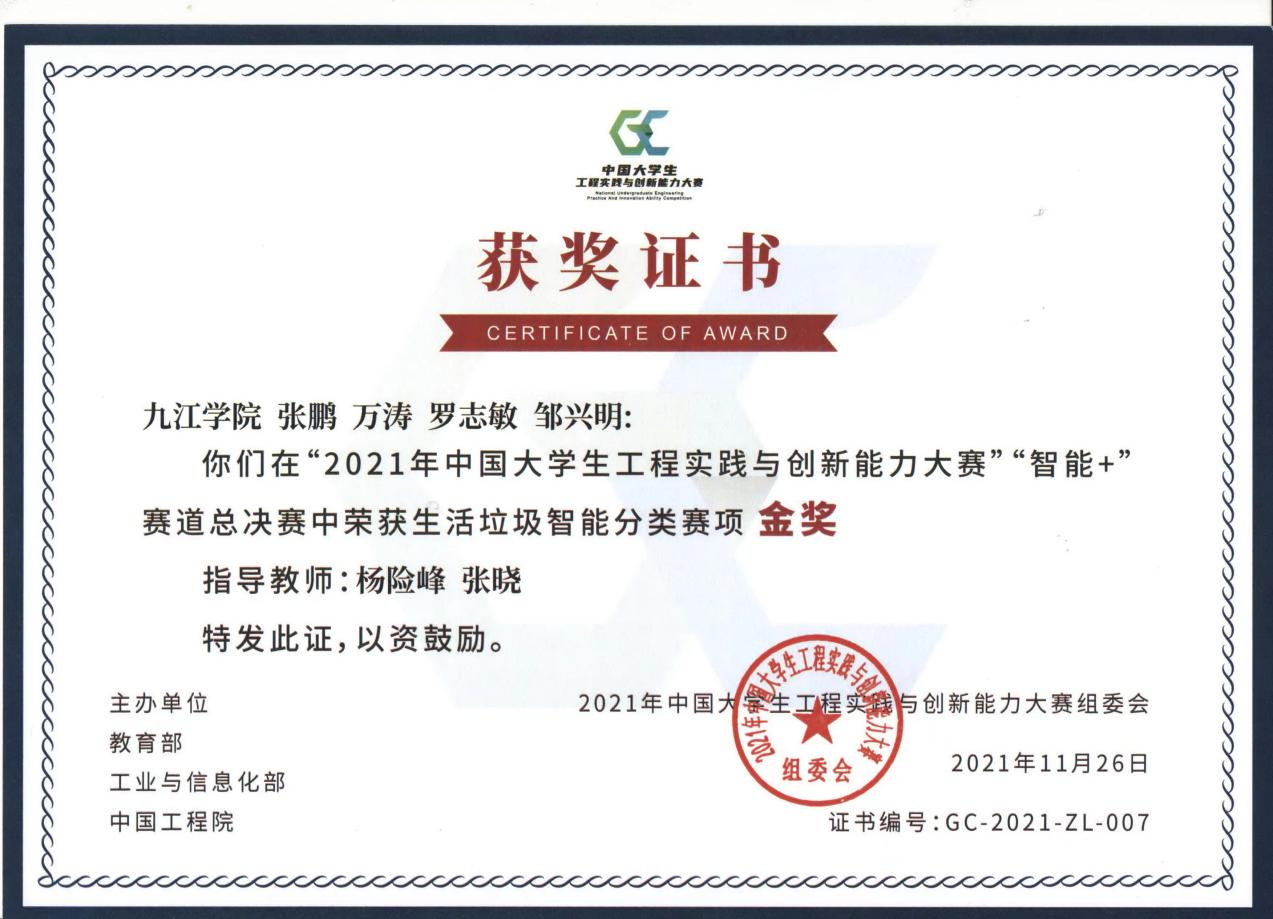 在2021年中国大学生工程实践与创新能力大赛全国总决赛中,我校学子发挥出色,勇创佳绩,荣获大赛总决赛金奖1项,银奖2项,获大赛历史最佳和江西省工程组第一名,位居全国第34;其中机械与智能制造学院的智能垃圾分类装置项目(学生:张鹏、罗志敏、邱海燕、丁立峰、刘泽荣,指导老师:杨险峰、张晓)获国赛金奖(全国第六名)、智能配送无人机项目(学生::吕苏伟、万钰雯、颜日广、陈雪魁,指导老师:刘对、曾宪任)获国赛银奖(全国第十一名);材料科学与工程学院的水下管道智能巡检装置项目(学生:汤俊、岳继强、徐杰、何武荣,指导老师:满达虎、张德勤)获国赛银奖(全国第十名)。中国大学生工程实践与创新能力大赛由教育部、工业和信息化部、中国工程院主办,是列入《教育部评审评估和竞赛清单(2021年版)》(教政法厅函(2021)2号)的重要赛事,是全国大学生工程训练综合能力竞赛的升级完善版,是高校工程类竞赛中最高荣誉、最高含金量、最高竞技水平、最具影响力的赛事。