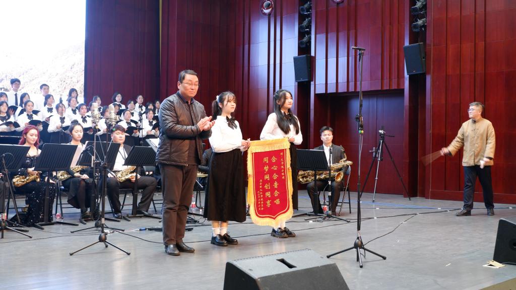 最后,音乐会在全体人员合唱《歌唱祖国》的嘹亮乐声中结束。
