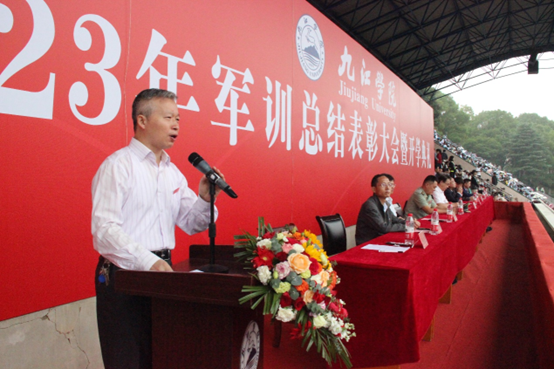 9月23日上午, 九江学院2023年新生军训总结表彰大会暨开学典礼在学校丹枫园南区运动场隆重举行。校党委书记李明斌出席大会,并代表学校向武警九江支队赠送锦旗。校长陈小林致辞,勉励2023级新同学勇担历史重任,锚定奋斗目标,淬炼专注品格。
