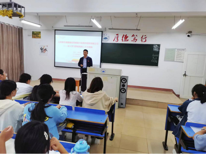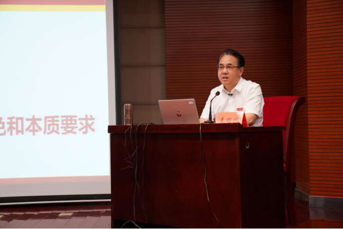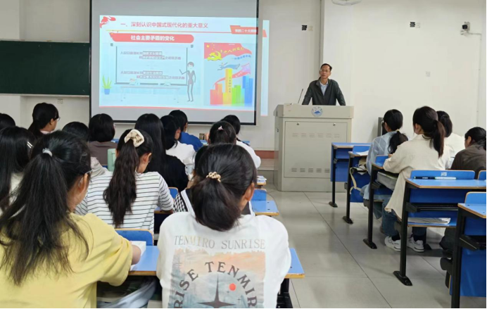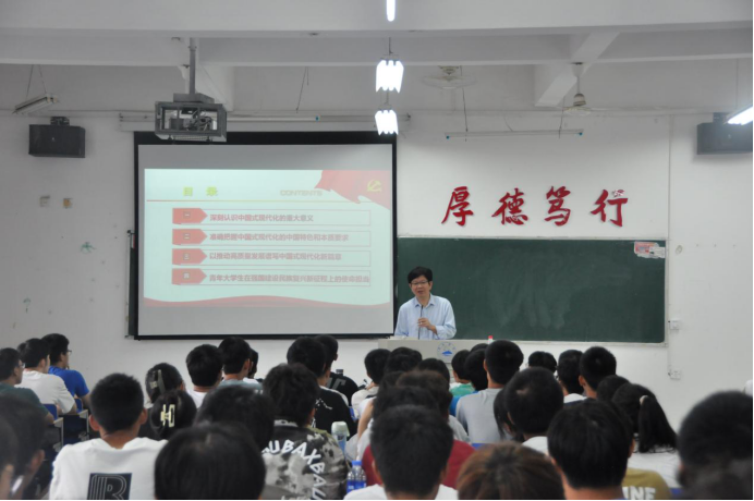 李明斌在授课时指出,党的二十大鲜明提出新时代新征程党的使命任务,发出全面建设社会主义现代化国家、全面推进中华民族伟大复兴的动员令。同学们要深刻认识党的二十大精神的历史性、划时代、里程碑意义;要深刻认识中国式现代化的中国特色、本质要求和重大意义。李明斌勉励2023级新同学把个人追求与民族复兴的责任担当紧密相连,把个人理想融入时代主题、汇入复兴伟业,自觉承担起自己的历史使命和时代责任,以勤奋学习为青春远航的动力,让增长本领成为青春搏击的能量,切实以优异成绩“让青春在全面建设社会主义现代化国家的火热实践中绽放绚丽之花”。