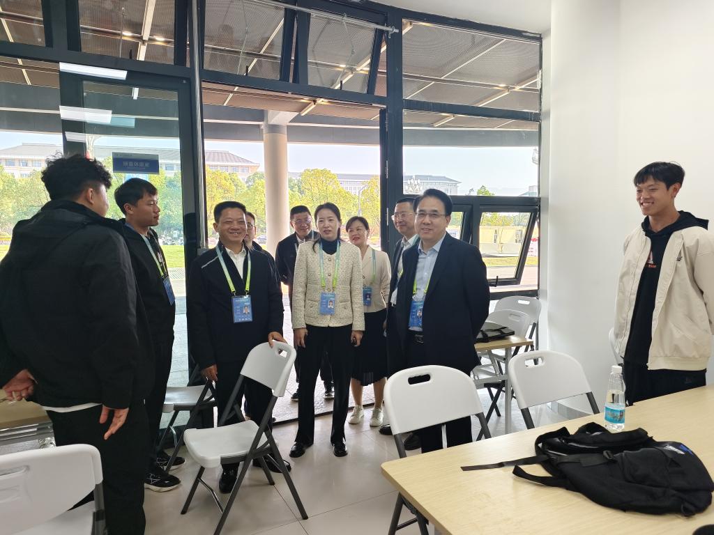 在与志愿者交流时,李明斌询问了他们在服务过程中的感受与收获。外国语学院英语专业A2213班戴英格同学激动地说:“能参与国际赛事的志愿服务,我感到非常荣幸,不仅学到了专业知识,还提升了沟通和协作能力。”