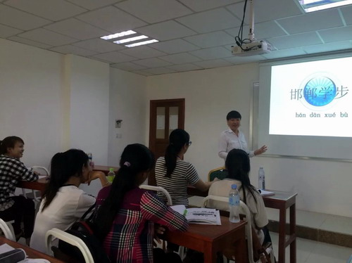 刘老师在解释邯郸学步这个成语时解释的特别精彩,充分结合实际情况使成语变得简单易懂,把中国的城市邯郸比作柬埔寨的城市马德望,学生更加觉得亲切易懂。整节课的气氛异常活跃,笑声不断,刘老师幽默的语言和动作让学生完全沉浸在讲座当中。