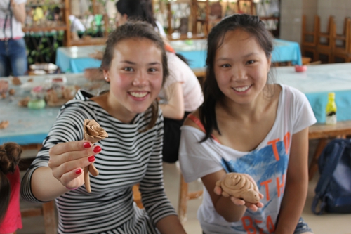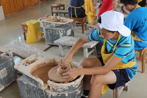 陶艺体验当然也是学习陶瓷文化必不可少的环节。7月27日,大家来到陶瓷体验区,在观看陶瓷大师制瓷时,营员们都认为:“这是一个简单的活,只是捏一捏,拉一拉就行了”。但是当来到体验区,大家坐到坯土面前都显得手足无措。营员们分成两组,认真听老师讲解的同时,自己也开始动手做,毕竟是第一次,大家都略显生疏,有些营员还会把泥土溅出来,可是时间久了,部分同学掌握了诀窍,在老师的帮助下,做出来的碗盘、碟子等等,还有模有样。但是也有些同学做的样子不太好看,略有失望同时也不舍不弃。营员们还进行了捏土、画坯的体验,有些同学捏出了很多卡通人物和动物,有些同学在盘子上画出各种各样的花型和玩偶。在短暂的时间里,大家积极参与,最后离开时,还带着恋恋不舍的心情,表示下次有机会过来,还要体验一把。
