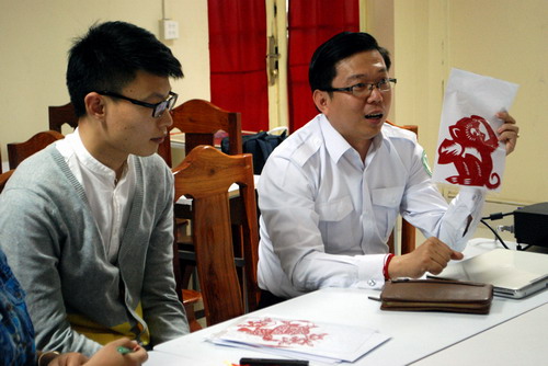 谢莫尼勒院长对春节的来历、习俗作了详尽的介绍——“过年”是因为赶走了一只叫年的怪兽,人们以示庆祝;“春节”表示春天、温暖、希望的到来;人们喜欢将“福”倒贴是因为它的谐音“福到了”;他还对春联、窗花、舞龙灯、鞭炮、大红灯笼高高挂等习俗作了详细介绍,学生们听得津津有味。