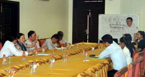 谢莫尼勒院长向客人介绍了孔子学院暹粒吴哥高中孔子课堂和暹粒省政府汉语官员班的发展历程,并在汉语课堂作了《中国“清明节”与柬埔寨“亡人节”》比较的文化讲座,来宾和学员对谢莫尼勒院长了解中柬文化之深表示佩服与惊叹。