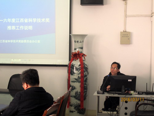 王主任依据2016年度江西省科学技术奖推荐工作说明,从推荐工作要求、推荐书填写要求、形式审查要点、申报注意事项四个方面进行了详细的介绍和讲解,并结合自己申报自然科学奖的推荐书,和与会教师分享了申报获奖的经验和推荐书撰写的技巧,与会教师请教了王主任很多申报和填写推荐书的问题。王主任还向化环学院介绍了一些硕士点申报的政策。