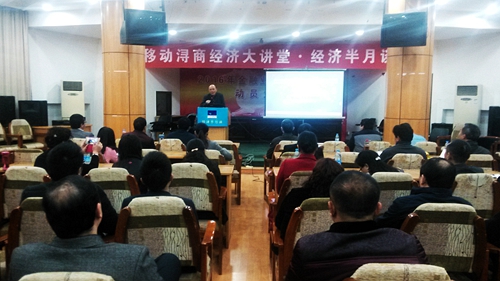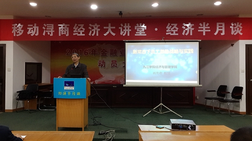 3月20日上午,九江企业联合会主办、经济与管理学院承办的“浔商经济大讲堂”如期举行,经济与管理学院肖克奇教授应邀作“新常态下员工激励战略与实践”主题讲座,讲座由九江市政府副秘书长、九江企业联合会名誉会长宋志龙主持,共有来自九江市中小企业老总及管理者60余人聆听讲座。
