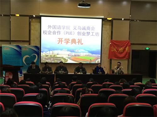 经过前期缜密筹备,我校外国语学院校企合作平台实现了与义乌城商会——创业梦工坊的首次合作,并于3月21日晚在香远楼3楼报告厅举行开课仪式。
