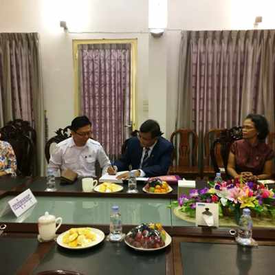 4月2日,谢莫尼勒阁下陪同王家研究院院长克洛媞达院士(Academician Khlot Thyda)拜访了柬埔寨教育青年体育部部长洪尊那隆博士(Dr. Hang Choun Naron),汇报了孔子学院组织汉语中心校长团赴厦门参加“中国—东盟中学校长论坛” 的有关情况及孔子学院承办“第九届中国-东盟教育交流周留学中国教育展暨黔柬高校合作交流洽谈会暨签约仪式”的筹备工作。洪尊那隆博士对孔子学院组织中柬教育交流的有关活动表示赞赏,并表示会大力支持“第九届中国-东盟教育交流周”活动,对他本人因出国访问不能参加“第九届中国-东盟教育交流周”的有关活动表示遗憾。