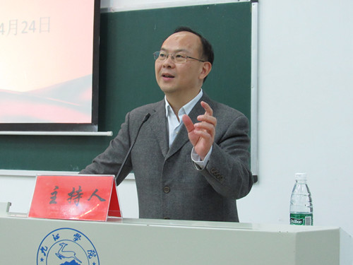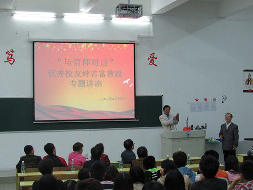 4月24号晚,基础医学院优秀校友钟吉富教授受邀于华文楼介二举办“与信仰对话”专题讲座。基础医学院院长车向新、党委书记余朝阳、副院长郑美蓉、全体辅导员、班主任以及各班学生代表聆听了此次讲座。
