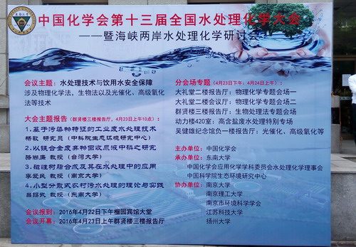 4月22日至25日,“中国化学会第十三届水处理化学大会暨海峡两岸水处理化学研讨会”在南京举行,化环学院吴中伟博士应邀与来自中国大陆、台湾和香港的112各单位的350余名专家学者和研究人员一道出席了会议。