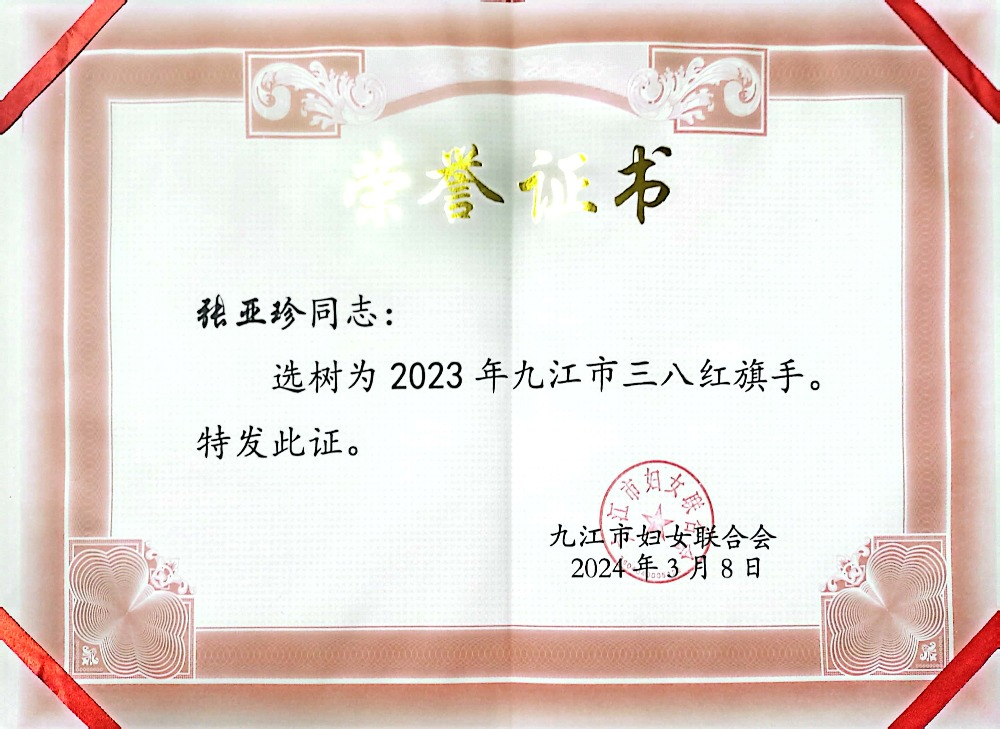 根据九江市妇女联合会下发的《关于选树2023年度九江市三八红旗手(集体)的通知》(九妇字〔2024〕1号),我校学生处魏晶晶、教育学院张亚珍两位老师获2023年度九江市三八红旗手称号,此次全市选树三八红旗手共有50名。