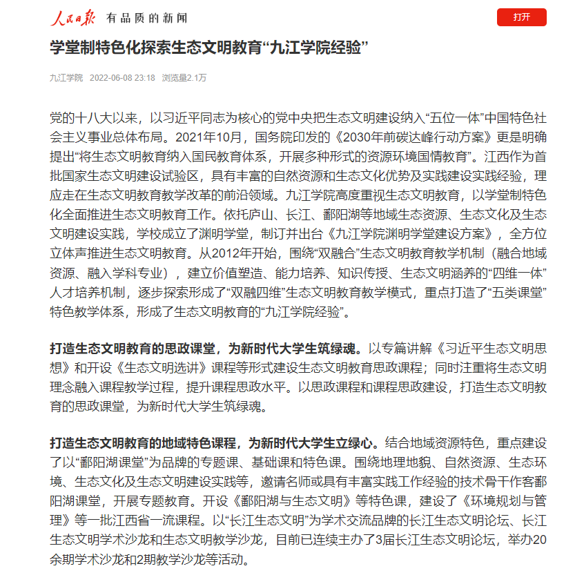学院依托教育部、省社科基金,省教改课题等开展生态文明教育主题研究、课程思政教学研究,成立生态文明教育虚拟教研室、鄱阳湖生态文明研究院,引导师生扎根赣鄱大地,取得明显成效。“问山问水”生态文明教育教学团队获批为省级高水平本科教学团队,阶段性成果获江西省教学成果一等奖1项,二等奖1项;《以学堂制特色化探索生态文明教育“九江学院经验”》被新华社、人民日报等主流媒体多次报道,新华社点击率超40万。