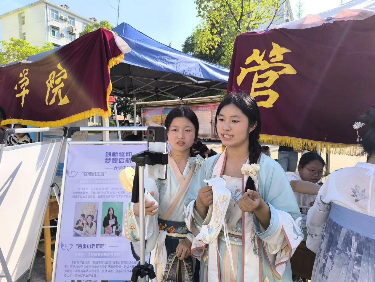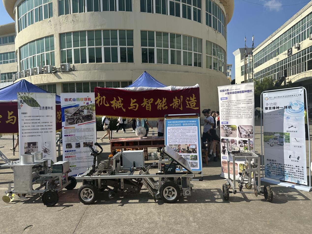 活动现场,机械与智能制造学院的小型半自动辣椒苗种植机、链式山药收获机、多功能豆类播种机等科技发明项目利用科学技术助力农业生产;管理学院的非遗布鞋项目利用新媒体技术和电商平台,帮助建立地方产业带动乡村振兴;建筑工程与规划学院充分发挥专业融合能力,围绕学校自身文化定制打造建筑类九院文创产品并成功上市售卖;教育学院通过人工智能技术,开拓丰富课堂教学手段;电子学院结合学院专业学科竞赛提升学生创新实践能力,荣获多项科技竞赛国家级、省部级奖项;文学院发挥自身专业教师特长,指导学生参加全国科普大赛荣获九江市一、二等奖及省优秀奖。