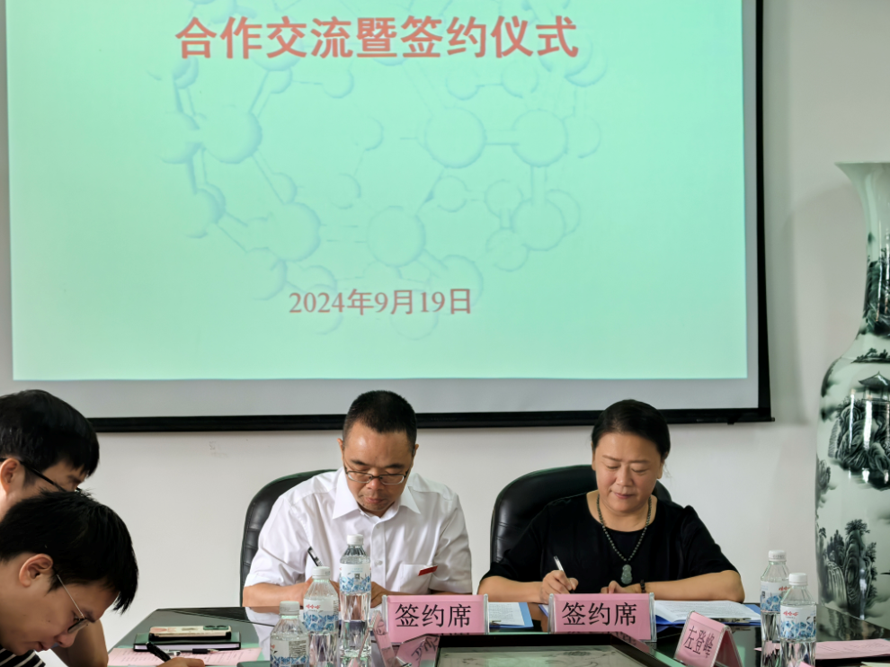 9月19日上午,化学化工学院与九江市同文中学合作洽谈会暨签约仪式在我校丹枫园校区向学楼五楼会议室举行。双方签署了合作协议,举行了人员互聘和交流研讨,并共同为“中学化学开放创新实验室”揭牌。