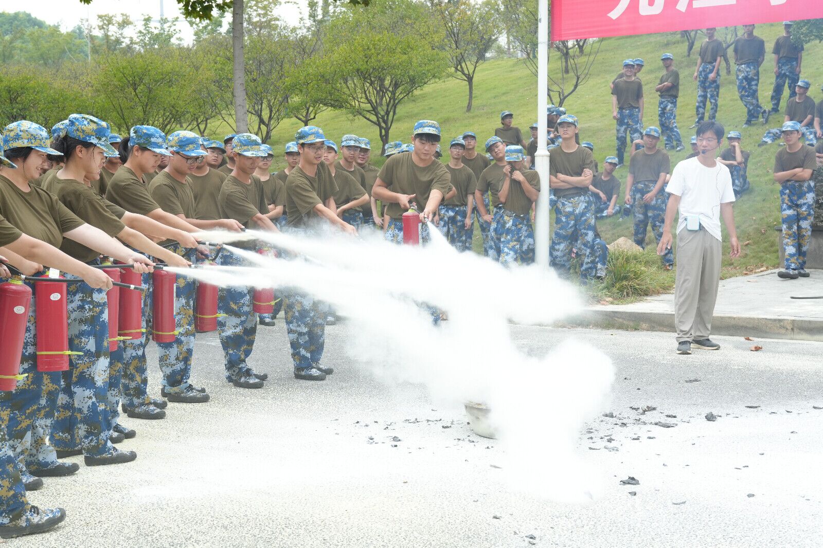 此外,为提高新生们的安全意识和应对突发事件的应急能力,学校组织安排了“消防进军训”活动。新生们在教官的指导下了解和掌握了消防安全“四懂”、“四会”和“四个能力”,学会了正确使用灭火器、消火水带等消防器材进行灭火,以及应急情况下正确疏散逃生的方法。