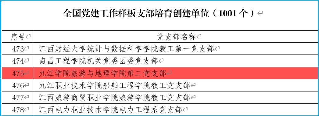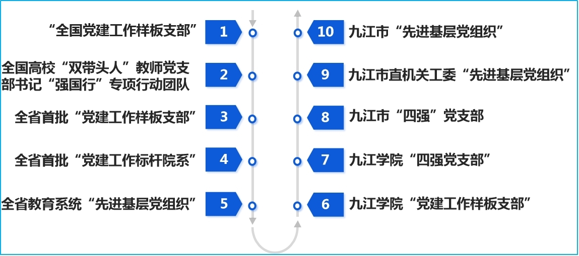 教工第二党支部2021年荣获全省教育系统“先进基层党组织”和九江市直机关工委“先进基层党组织”称号;2022年荣获九江市直单位“四强”党支部称号、九江学院“四强”党支部称号;2023年获批江西省首批“全省党建工作样板支部”;2024年获批第四批“全国党建工作样板支部”培育创建单位、全国高校“双带头人”教师党支部书记“强国行”专项行动团队、九江学院“先进基层党组织”称号。