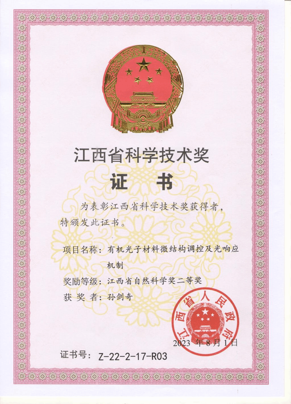 荣获江西省高层次人才称号证书