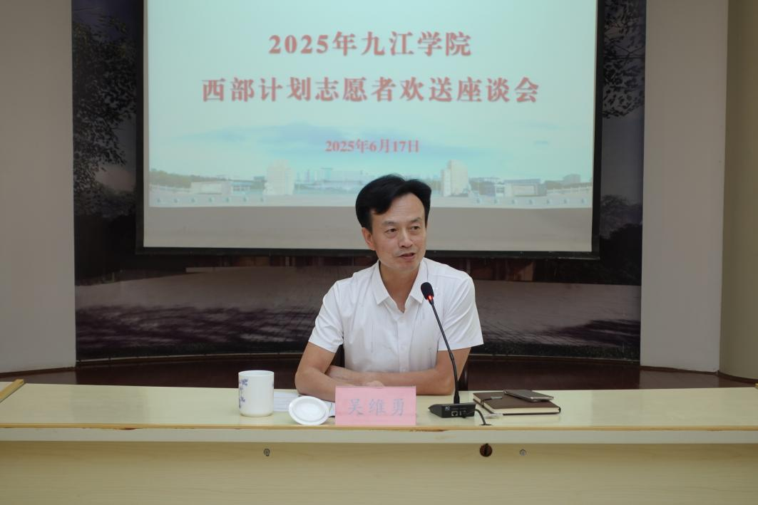 为推动志愿服务西部计划项目高质量发展,激励学生积极投身基层工作,6月17日上午,九江学院2025年大学生志愿服务西部计划志愿者欢送座谈会在学校行政楼一号会议室召开。校党委委员、副校长吴维勇出席活动并讲话。