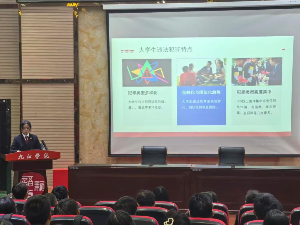 仪式结束后,法治校外辅导员代表程艳霞以《青春不“刑”动——大学生违法犯罪风险防范与自我保护指南》为题开展专题讲座。她从大学生犯罪现状与认知误区、五大犯罪类型及典型案例、反诈专项、毒品专项、犯罪行为原因剖析、多维预防措施六个方面切入,引导青年学生要认真学习法律知识,学会运用法律武器维护自身合法权益,同时提醒大家在日常学习和生活中严守法律底线。
