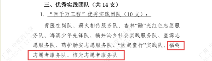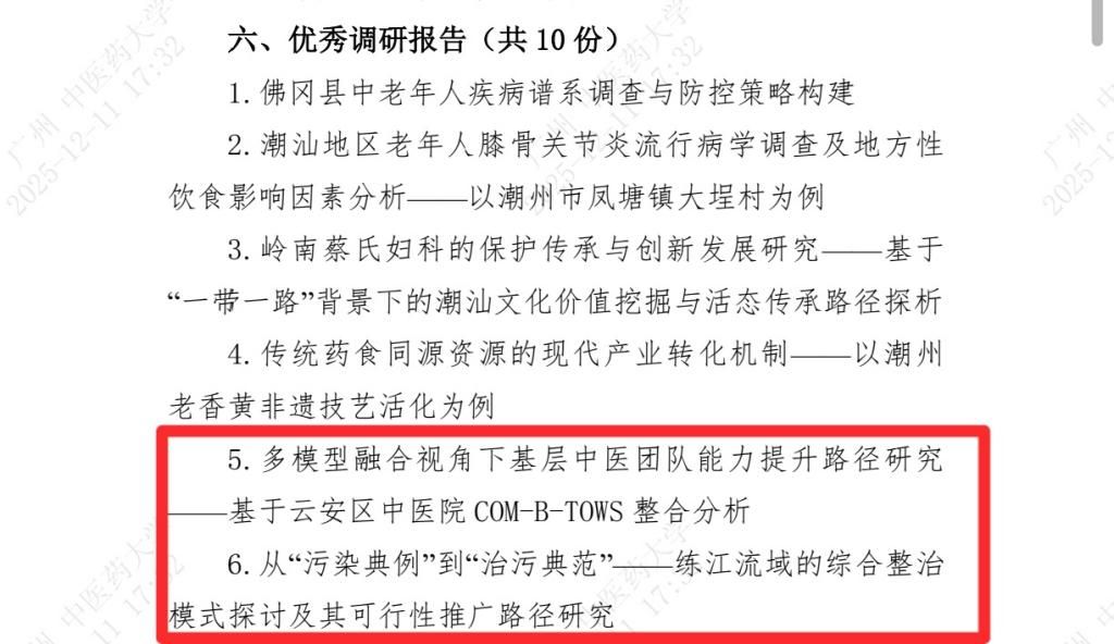 我院各团队在下乡期间,深入基层一线,直面现实问题,运用专业知识开展实证研究,榕光志愿者服务队撰写的调研报告“多模型融合视角下基层中医团队能力提升路径研究 ——基于云安区中医院 COM-B-TOWS 整合分析”与仙桥黄鹤志愿者服务队撰写的调研报告“从“污染典例”到“治污典范”——练江流域的综合整治模式探讨及其可行性推广路径研究”荣获校级“优秀调研报告”称号。