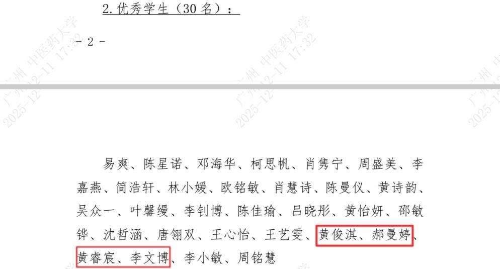 优秀学生获奖名单