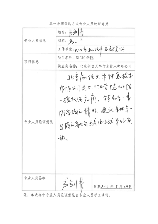 采用单一来源采购方式的原因及说明:北京创信天华信息技术有限公司是“51CTO学院”项目唯一授权供应商,符合政府采购单一来源情形,建议采用单一来源采购方式,由北京创信天华信息技术有限公司具体实施。